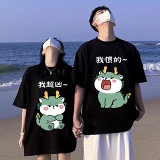 Kaos Couple Katun, Desain Naga Kartun, Baju Setengah Lengan Trendy, Cocok untuk Pantai