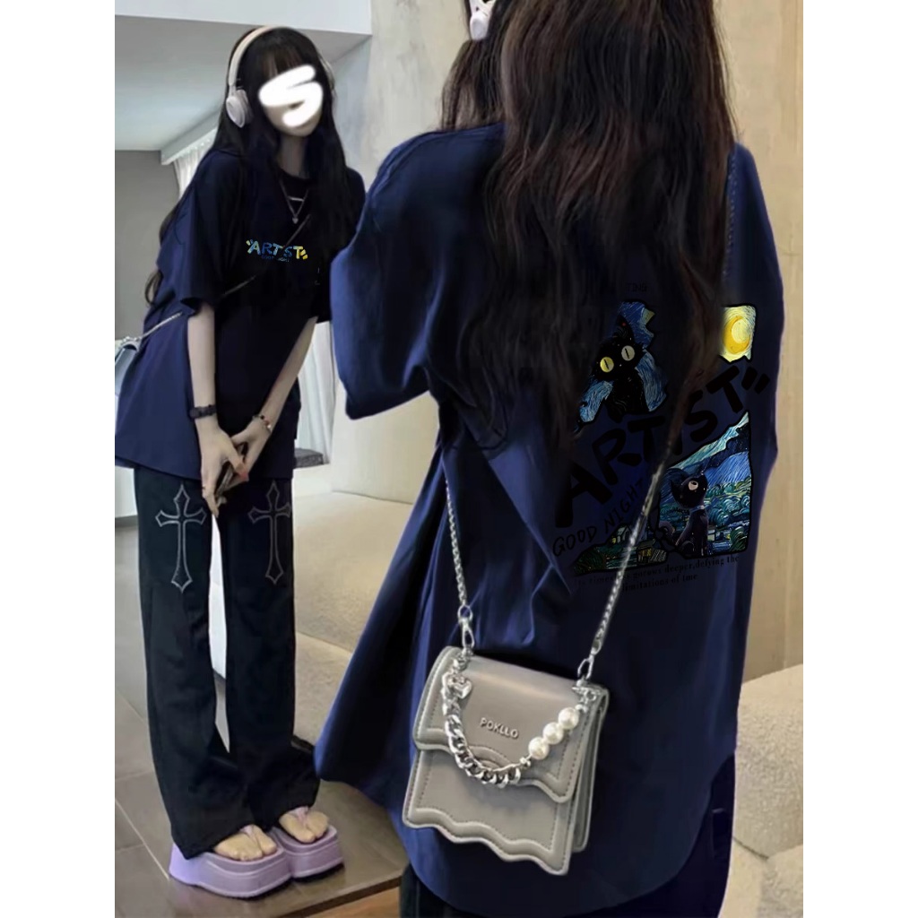The Monseur Gallery Kaos Wanita Oversize ARTIST Star Cat Style baju atasan wanita terbaru | Kaos baju Navy blue