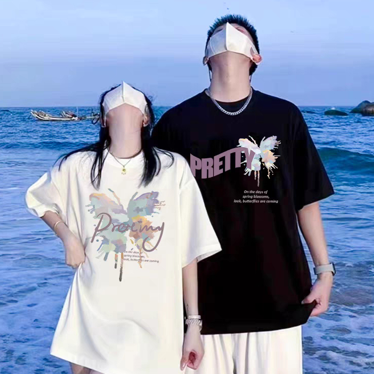 Kaos Couple Kupu-Kupu Warna Warni Romantis, Pendek, Lebar, Katun Nafas, Unisex