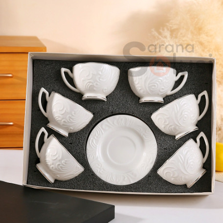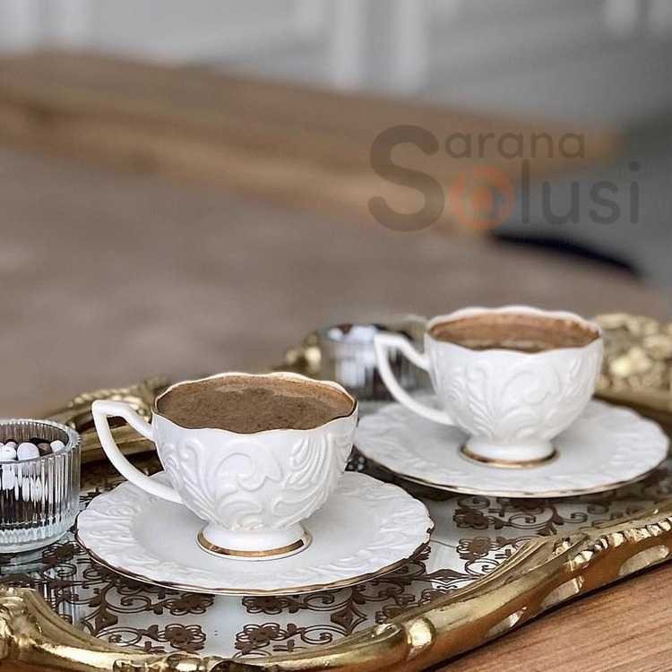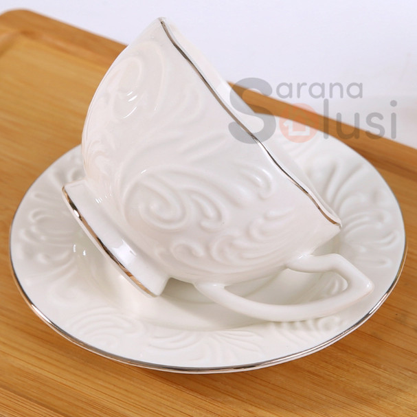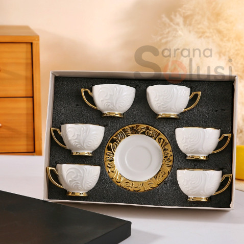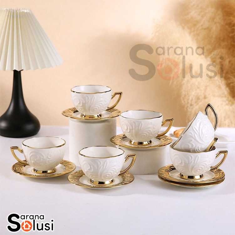 Cangkir Keramik Set 6 in 1 Gelas Kopi Teh Embos Mewah Elegan Estetik 90 ml dan 220 ml