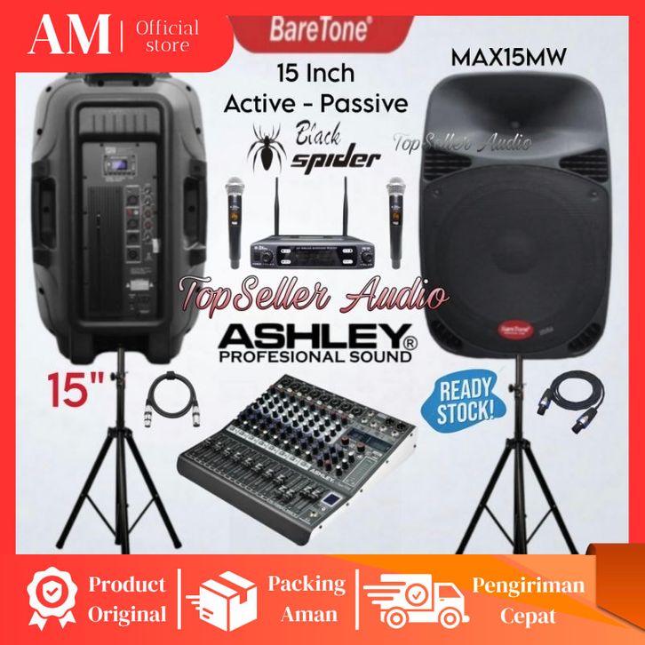 Home Theater 1 Set Karaoke Paket Sound System BareTone 15 Inch ( Active & Passive ) Mixer Ashley 8 Channel 2 Mic