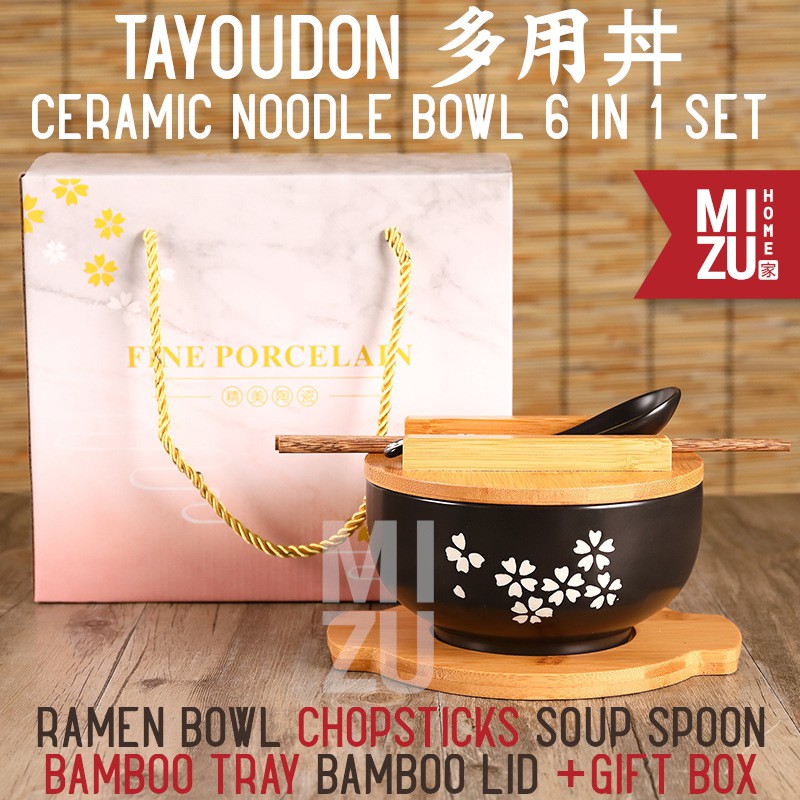 MIZU TAYOUDON SAKURA Ceramic Noodle Ramen Bowl Gift Set Mangkok Mie Sumpit Sendok Nampan Tutup Bambu