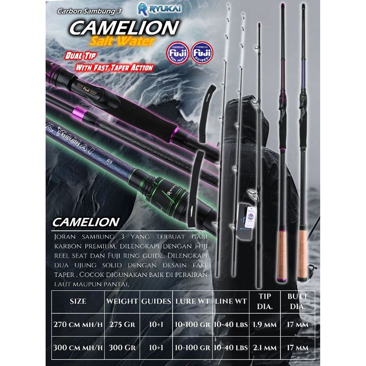 TERLARIS Joran carbon solid sambung 3 pasiran laut 10-40 lbs bonus 1 tip ujung solid carbon Ryukai Camelion
