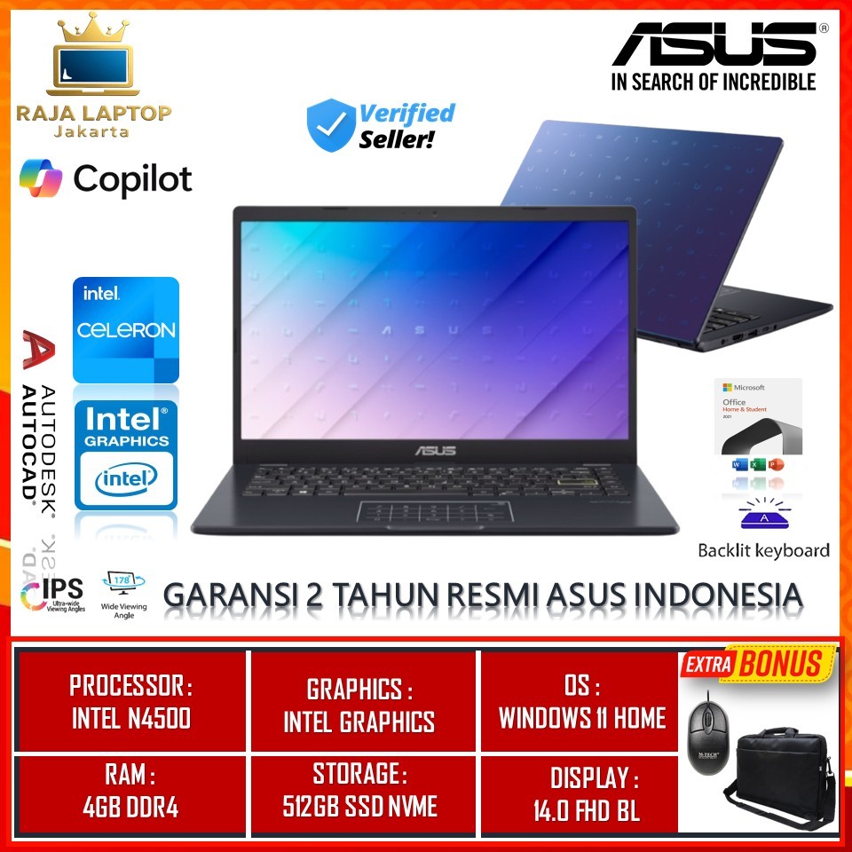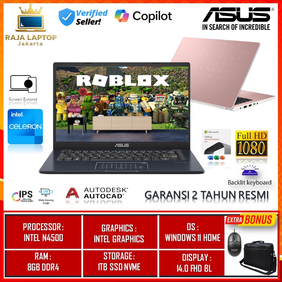 Laptop Slim Asus Vivobook Go GO 14 E410KA FHD424M/FHD425M Intel N4500 Ram 8GB 1TB SSD Wind 11 Home