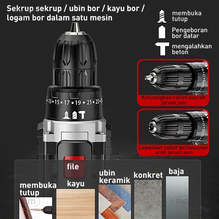 Reaim 218V 3 Speed Mesin Bor Baterai Tangan Cordless Drill Battery impact drill Cordless Electric