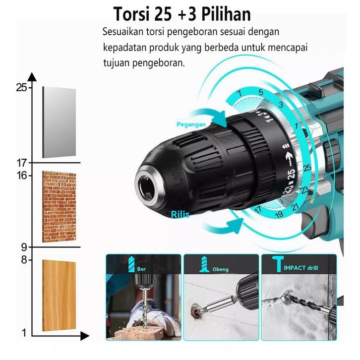 MAKlTA 766V 3 Speed Mesin Bor Cordless/Bor Baterai/ Bor Listrik/Beton Besi Kayu Full Set Pilihan Bor