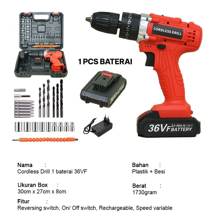 Mesin Bor Baterai Tangan Cordless Drill 1 Battery 36V Fullset Koper Alat Cas Listrik - G11A1