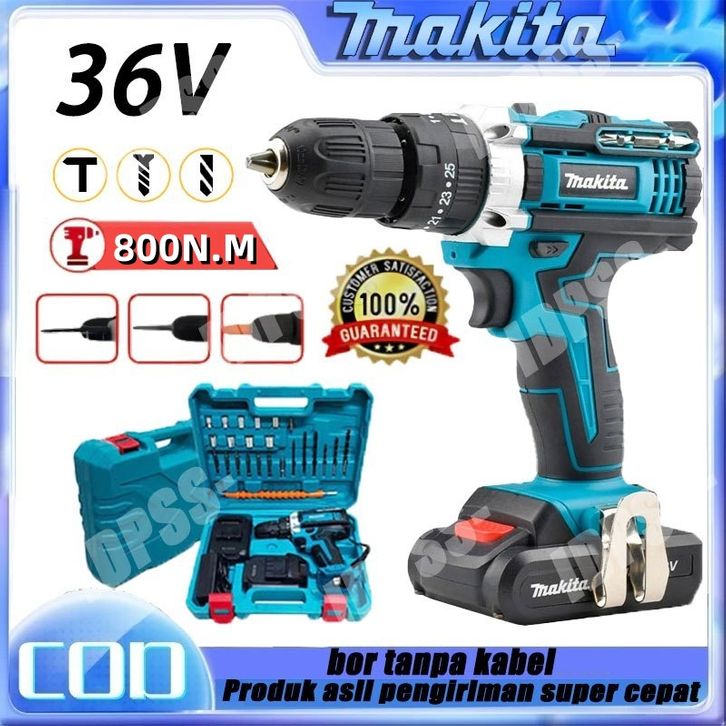 MAKITA Bor Impact Elektrik Makita 36V Tanpa Kabel dengan Mata Bor dan 2 Baterai Alat Obeng Bor
