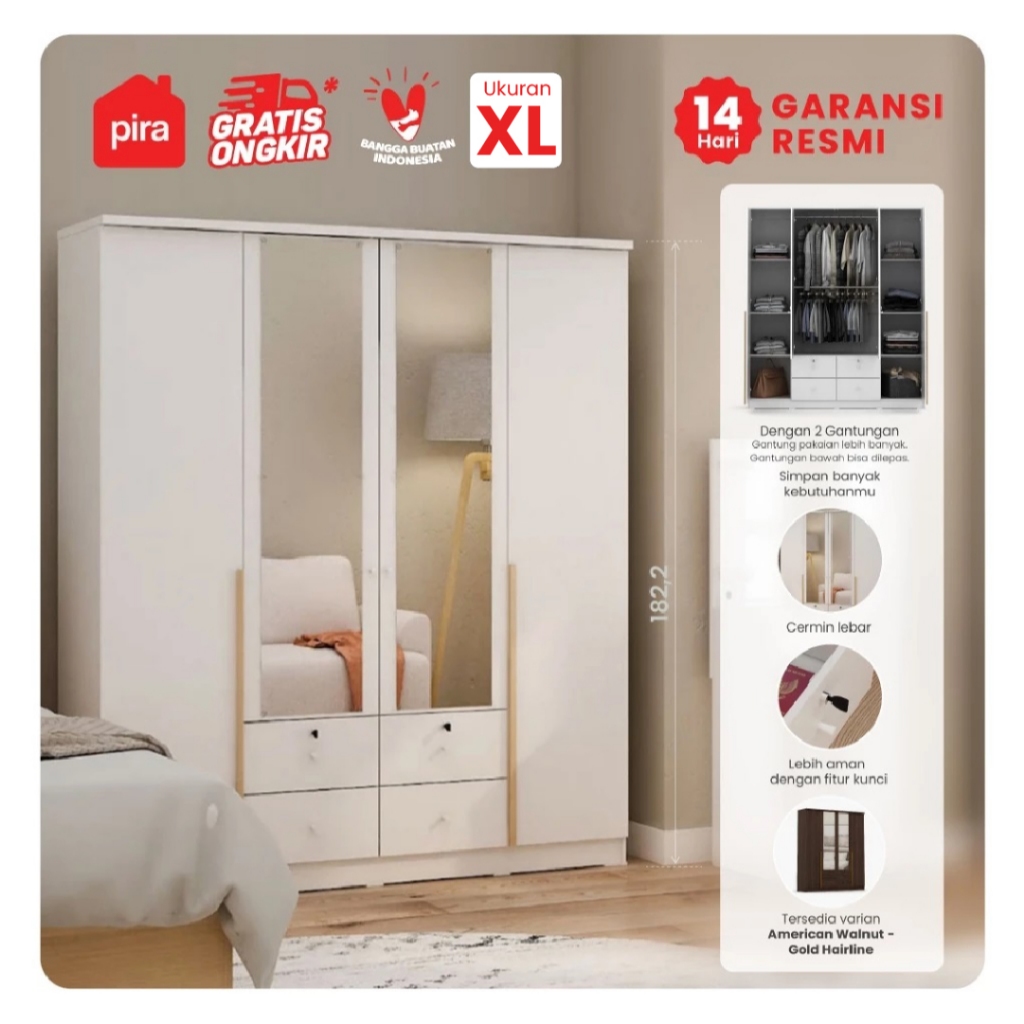 PIRA METROPOLIS YONA 4P 4DR LEMARI PAKAIAN 4 PINTU DENGAN 4 LACI