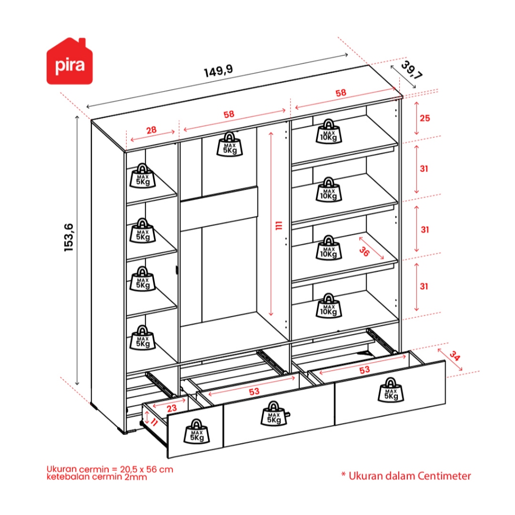 PIRA METROPOLIS OX ARUNA BL5P 3DR LEMARI PAKAIAN 5 PINTU LEMARI BAJU DENGAN LACI