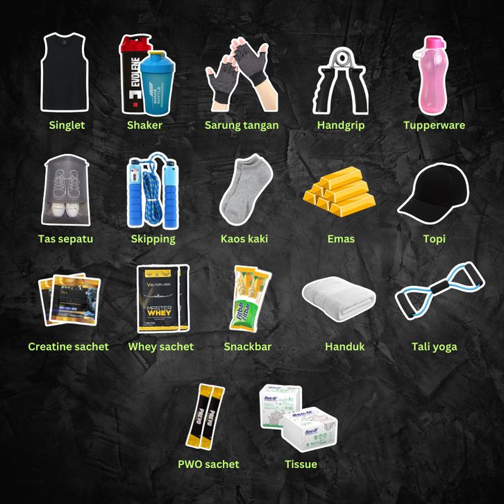 1 Handgrip, 1 pro creatine, 1 shaker, 2 Kaos kaki, 2 M45, 2 Skipping, 2 Tissue 150 sheet, 2 handuk, 2 snackbar, 2 tas sepatu, 2 tumblr, 4 snackbar, Mix 2 bonus di note, Tanpa bonus