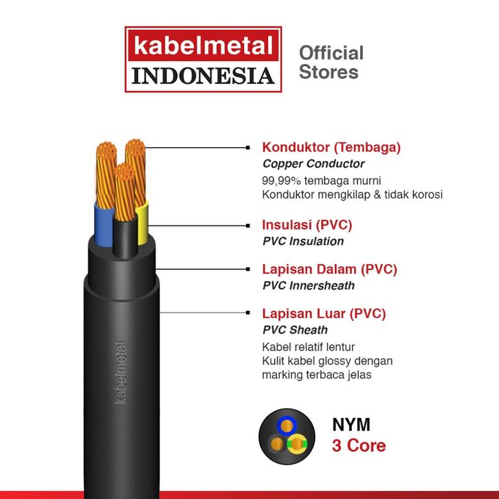 Kabel NYY 3x4 mm 100 Meter Roll kabelmetal INDONESIA - Tufur Outdoor Kawat Tembaga Tunggal PVC Hitam Listrik KMI SNI