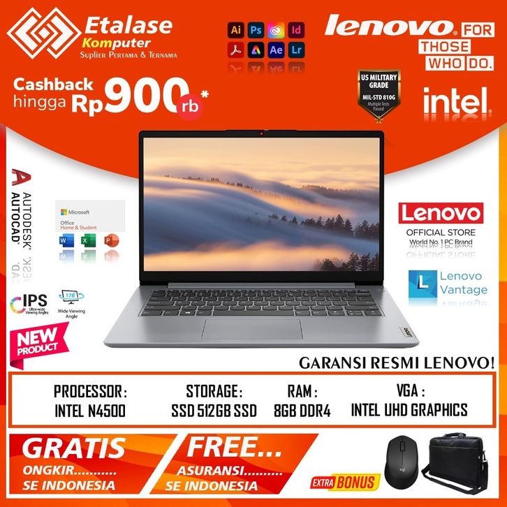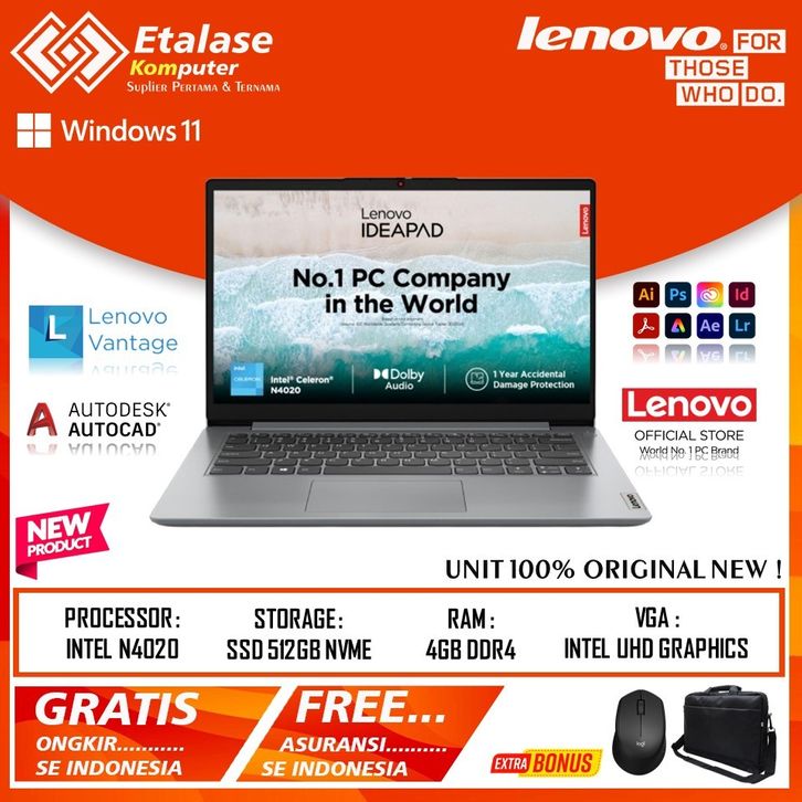 LAPTOP LENOVO IDEAPAD SLIM 1 14 INTEL N4020 N4500 RAM 8GB 512GB 14 INCI WINDOWS 11 CLOUD GREY