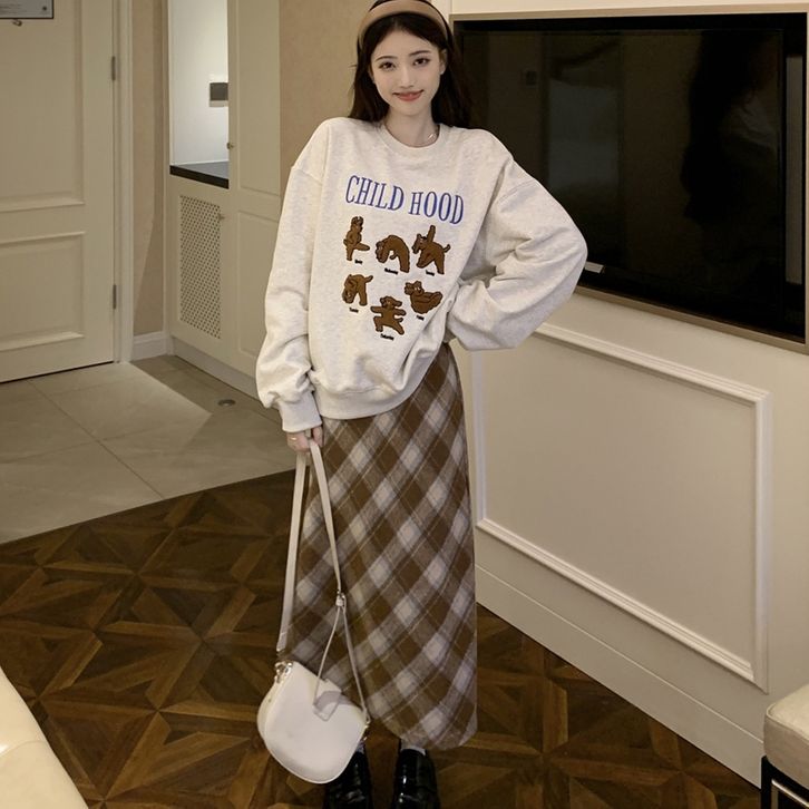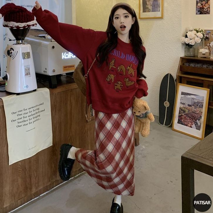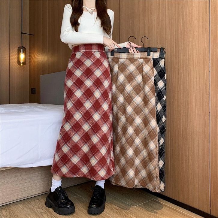 Rok Kotak-kotak Retro Pinggang Tinggi Rok Midi Belah Wanita Rok A-line Serbaguna Temperamen Pa BY ORIGINAL PRODUCT