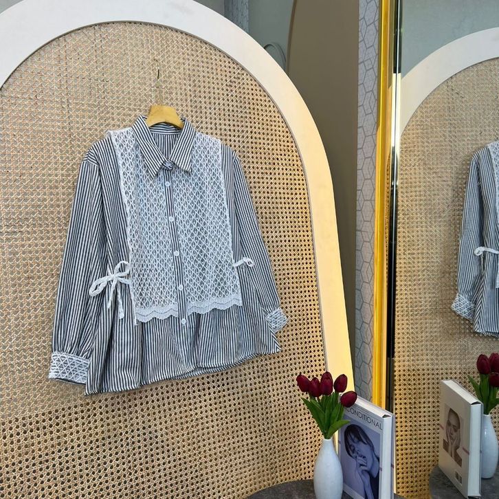 Jennie Blouse Salur Kombinasi Brukat Premium Kemeja Atasan Wanita Tangan Panjang Motif Garis