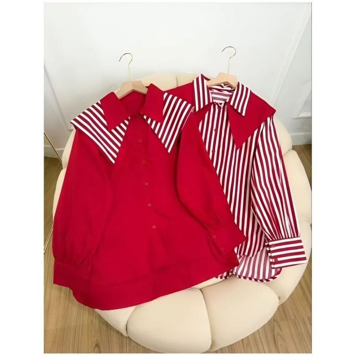 Vallina Outfit - Lista Top Blouse Atasan Wanita Muslim Merah Putih l 17 Agustus Matt Cringkle Mix Katun Salur Premium