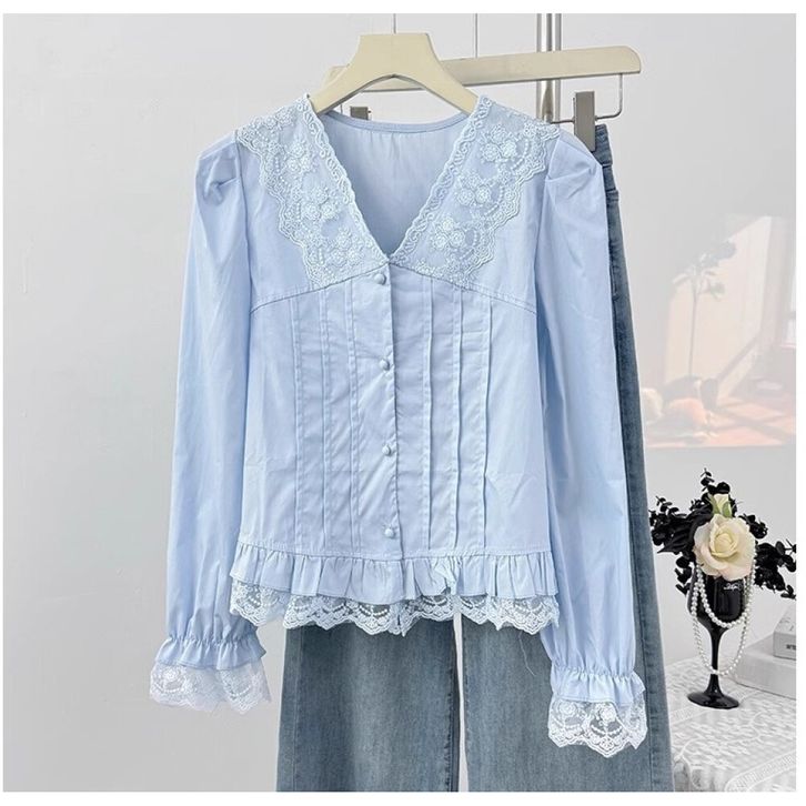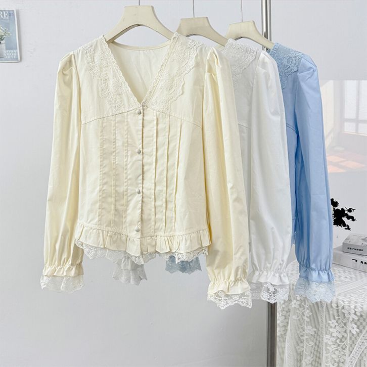 Atasan Kemeja Lengan Panjang | Puff Kerah V | Original By CHICMORE | Dengan Kancing Sebaris Cantik | Retro
