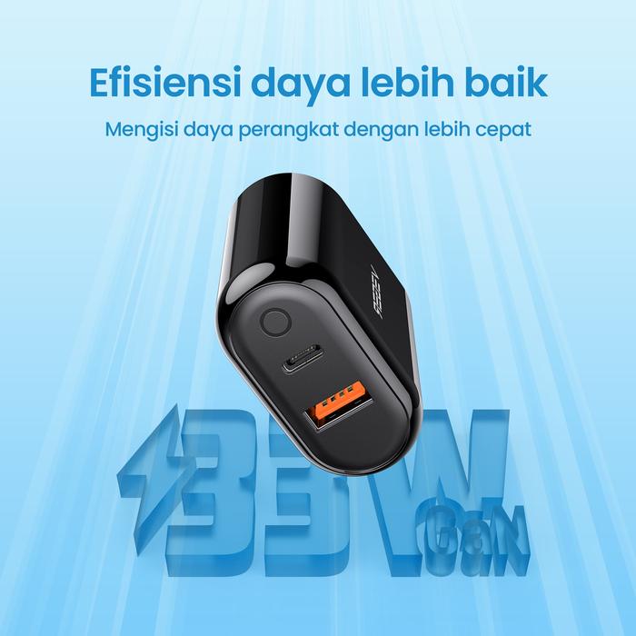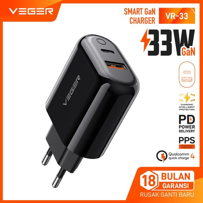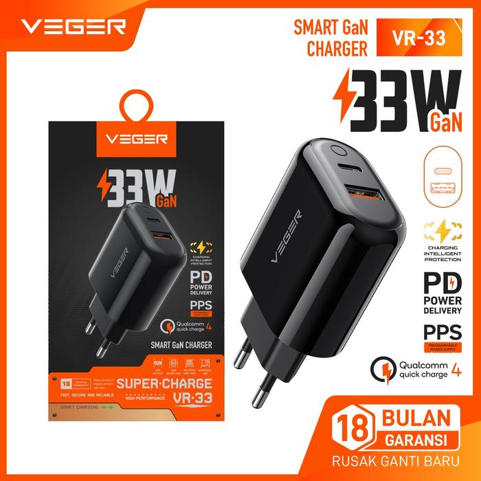 VEGER VR-33 Charger USB + PD 33Watt 2 Port Output Smart Gan Charger Fast Charger