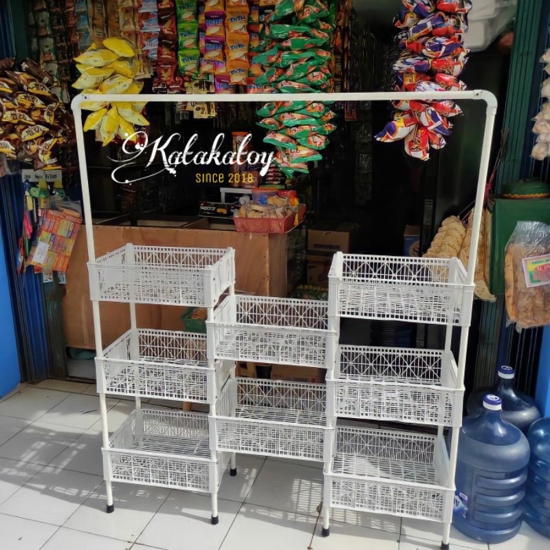 RAK JAJANAN WARUNG SEMBAKO RAK SNACK KERANJANG UNTUK MENARU MAKANAN RINGAN DAN KEMASAN LAIN NYA