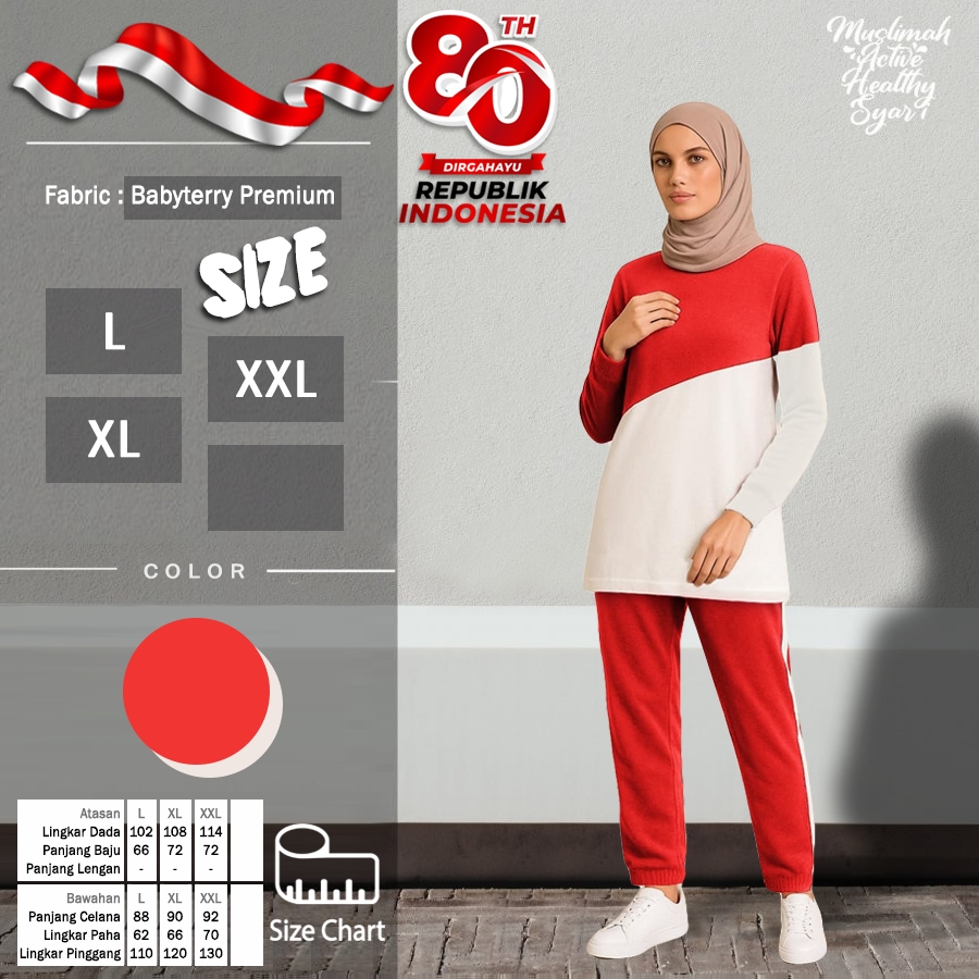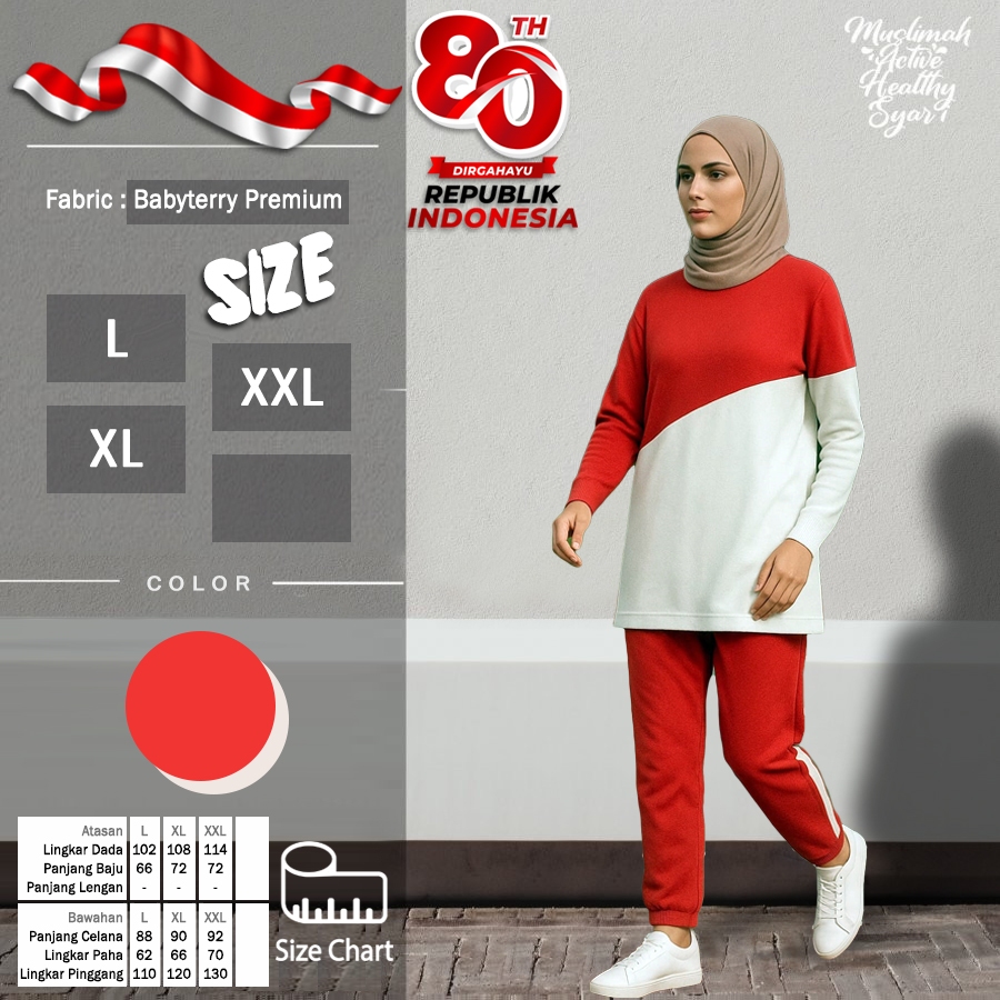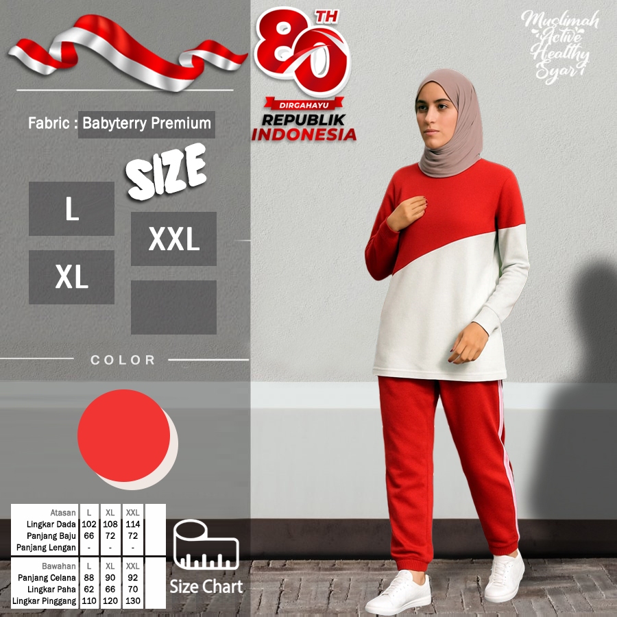 MERDEKA SET Setelan Kaos Celana Training Olahraga Wanita Muslimah Edisi Dirgahayu Indonesia Merah Putih Lengan Panjang S