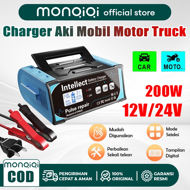 Monqiqi Charger Aki Mobil Motor Truck Kapal Elektrik Otomatis Auto Repair Mobil Pengisi daya 12v24v 200W