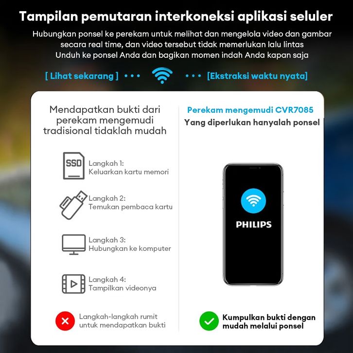 Philips CVR-206 3 Cameras Dashcam Mobil Depan Belakang 1080P Night Vision kamera Mundur Dvr Mobil