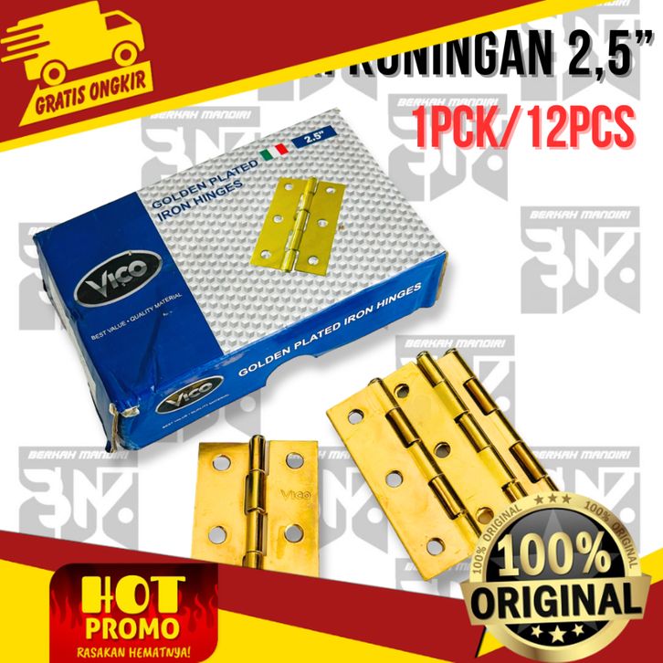 1PCK/12SET Engsel Lemari, Jendela, Laci Ukuran 2,5 inch Vico Gold Kuningan Engsel GP Golden Plated Iron Hinges