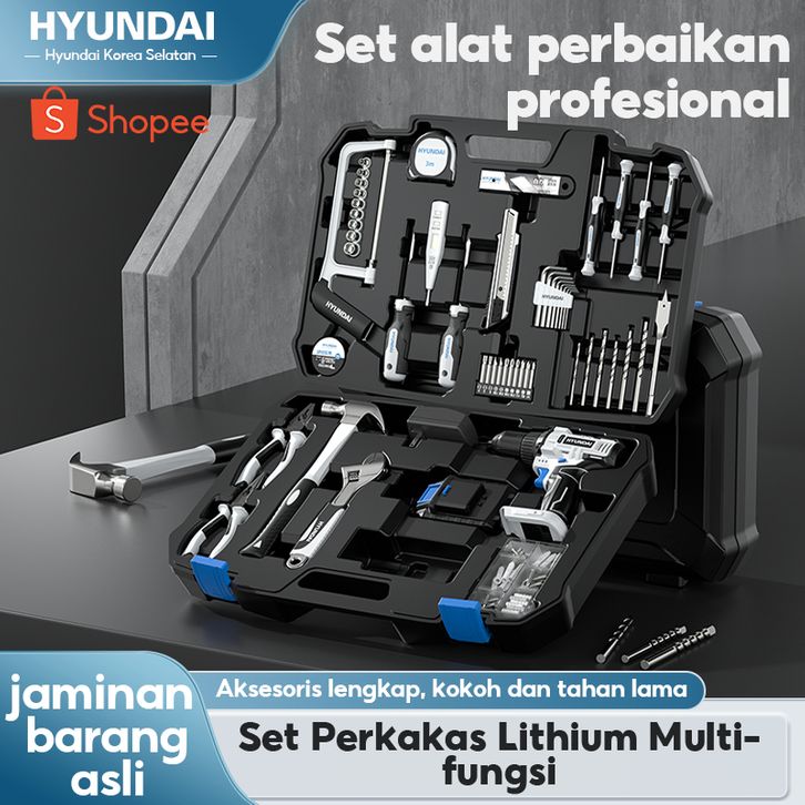 HYUNDAI Mesin Bor Listrik Set Lengkap Baterai Cordless Alat Tukang Tool Kit Tang Obeng Palu Kunci Pas Pita Pengukur