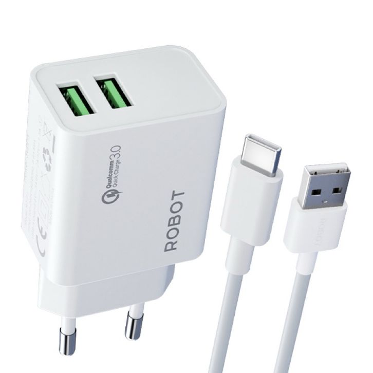 ROBOT RT-P3 Charger Dual USB Port A+A Fast Charging 18W QC3.0 with Type-C Cable