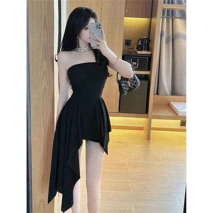 66TT Dress Darling CFM001 Desain Niche Tube Top Yang S33ks1 Dan Feminin, Pinggang Tidak Beraturan, Gaun Hitam Serbaguna