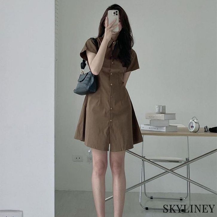 Gaun Retraksi Pinggang Gaun Gesper Baris Tunggal Kerah Lipat Gaun Kemeja Lengan Pendek SL