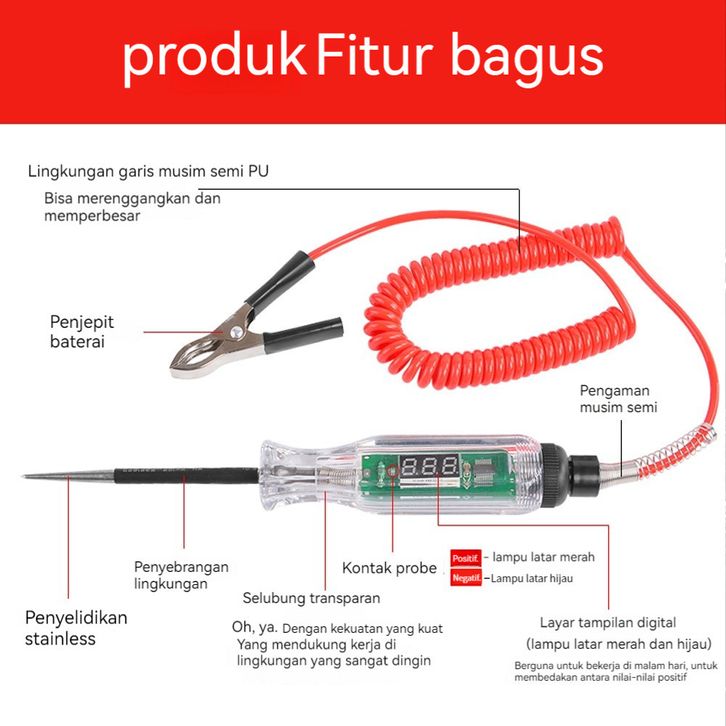EKSKLUSIF 3V-36V DC Mobil Truk Sirkuit Tegangan Tester Digital Display Long Probe Pen Light 6V 24V enabmn