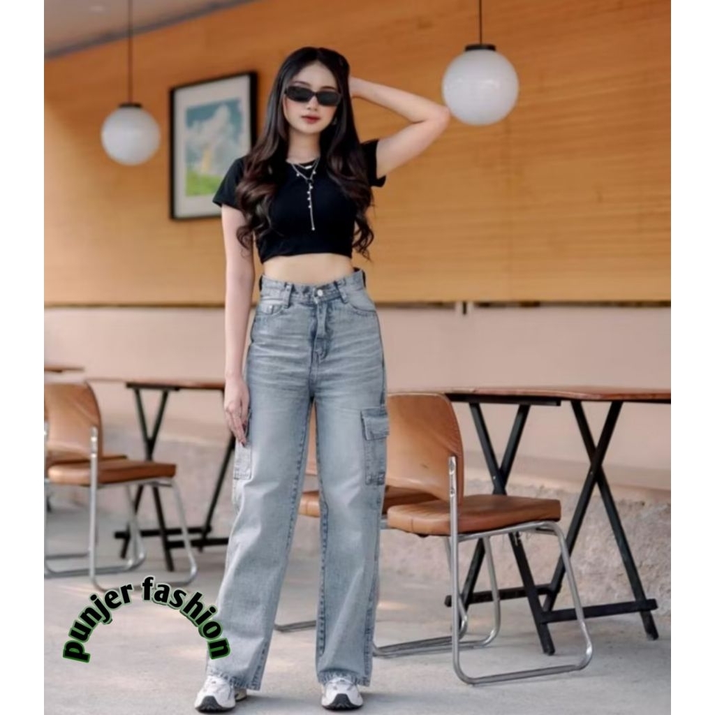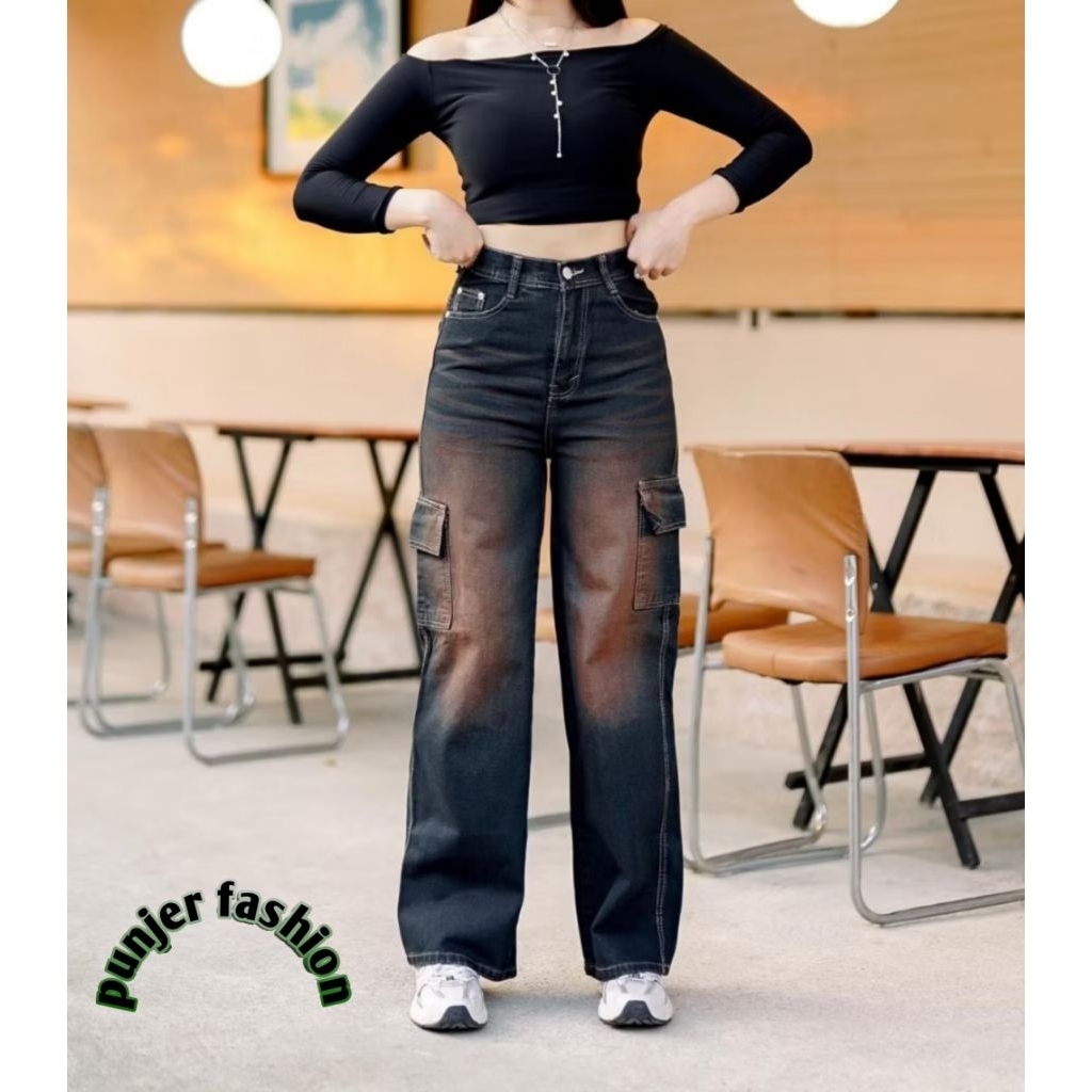 HIGHWAIST CARGO JEANS BAGGY LOOSE WANITA // cargo jeans retro highwaist