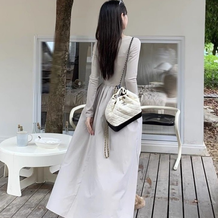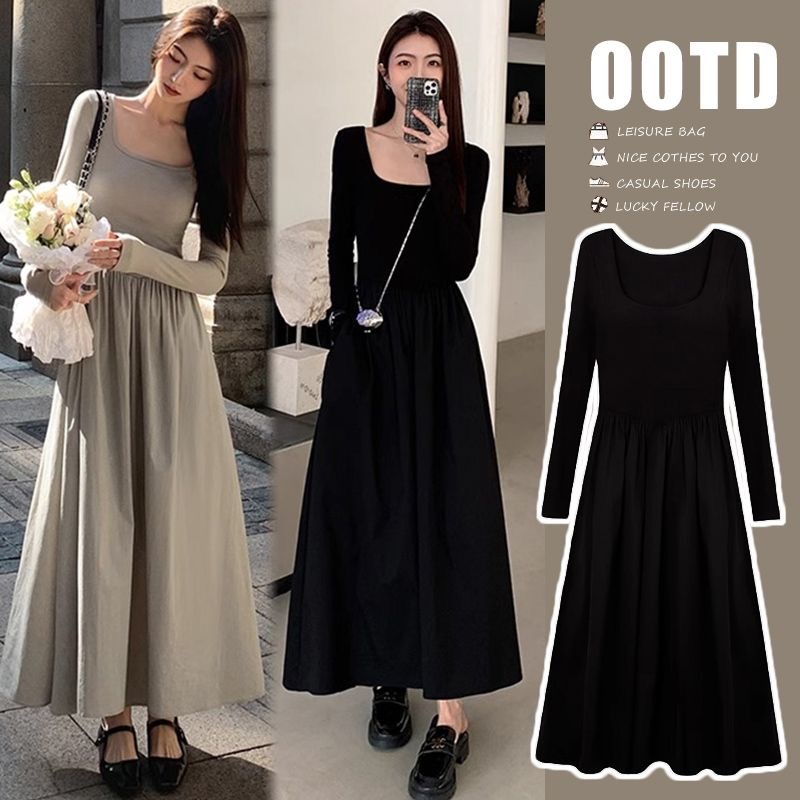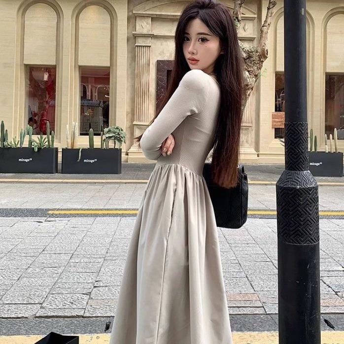 Gaun Musim Gugur Gaun Prancis Baru Gaun Hitam Gaun Coklat Muda Gaun Panjang A-line Sambungan Rajutan Lengan Panjang Lehe