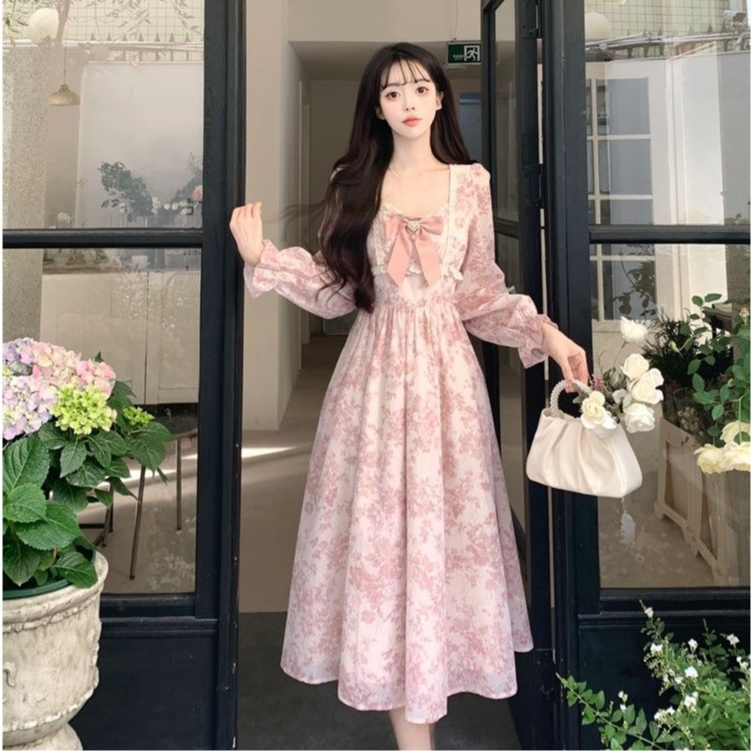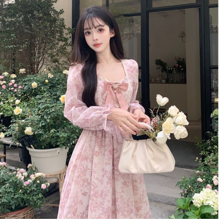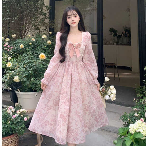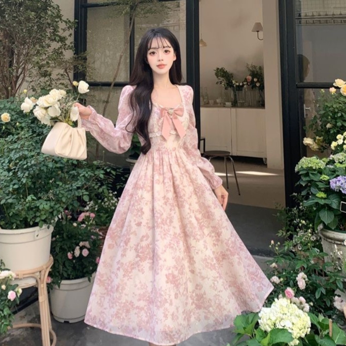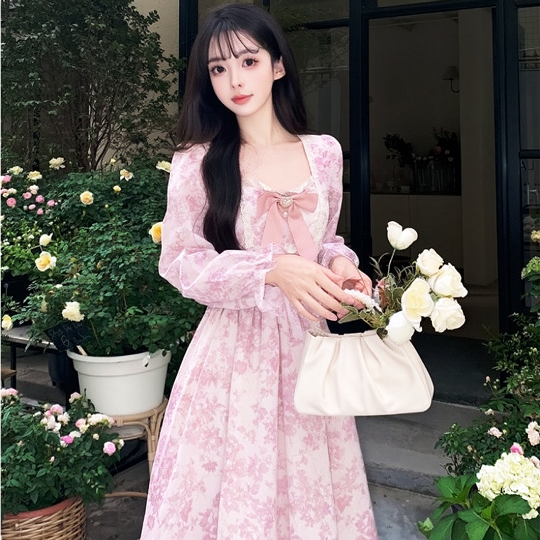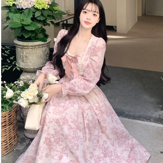 French Long-Sleeved Pink Dress/Floral FairyDress/Yearbook Clothes/Adult Princess Clothes