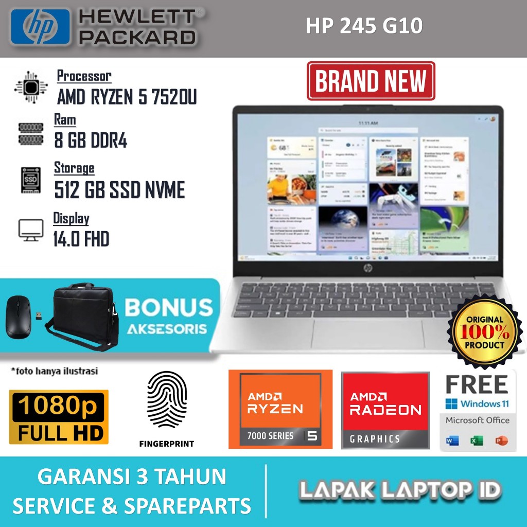 Laptop HP 245 G10 AMD Ryzen 5 7520U RAM 8GB 512GB SSD Nvme Full HD Finger Print Windows 11 Home