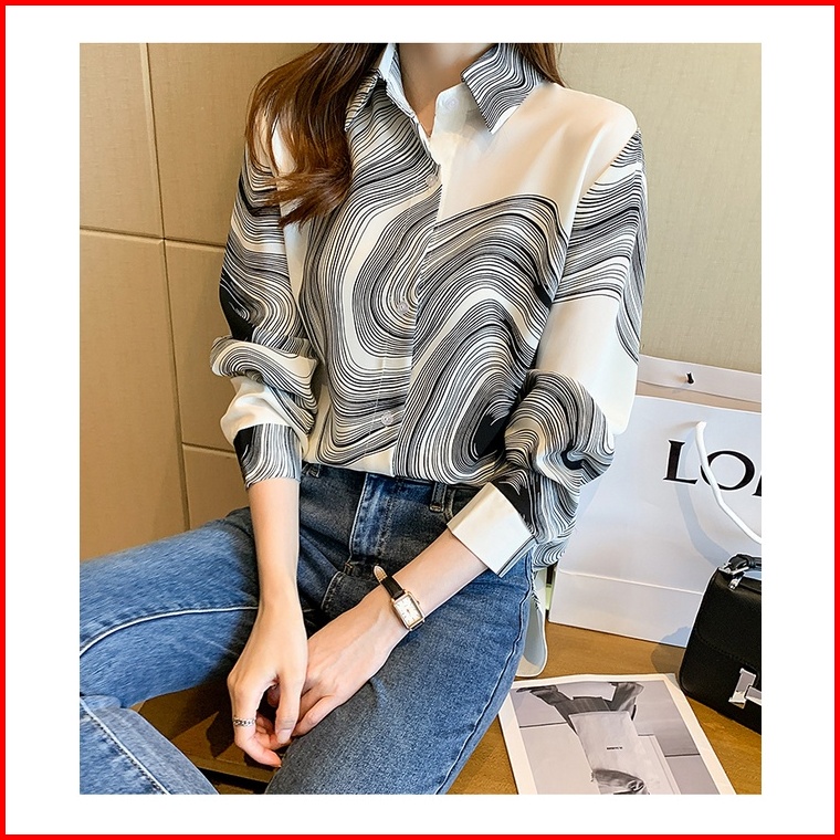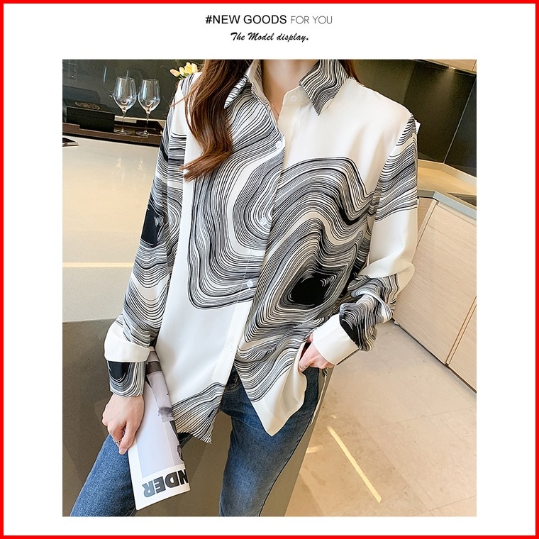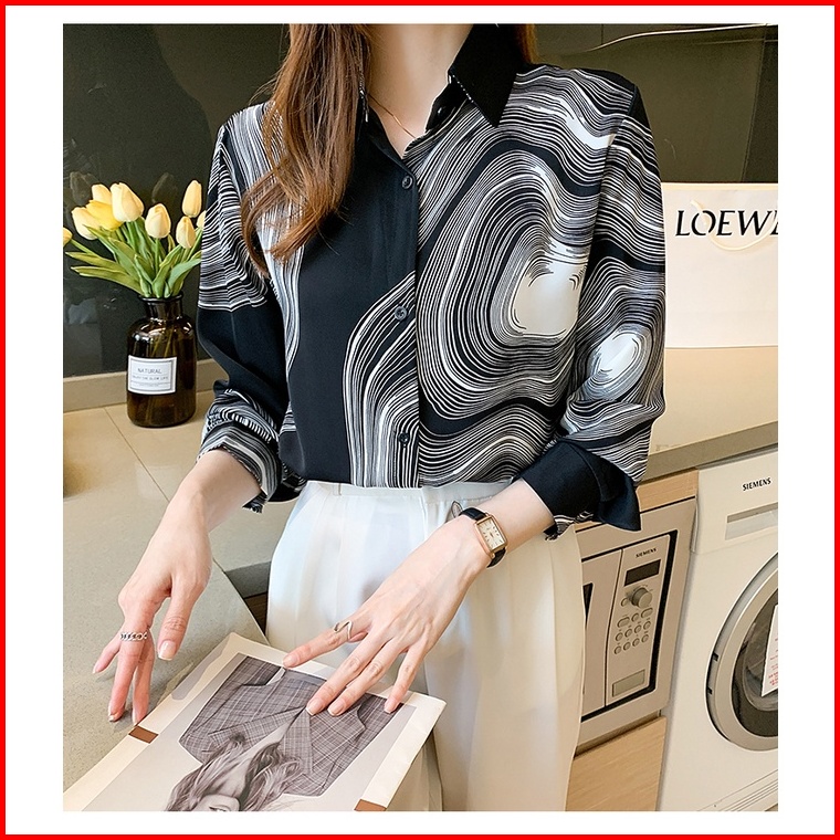 Tianshun Fashion Korean Geometric Pattern White Black Long Sleeved Chiffon Top Women S Casual Shirt