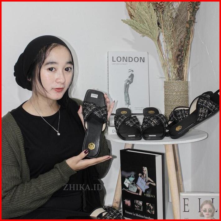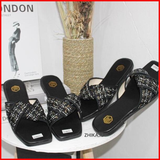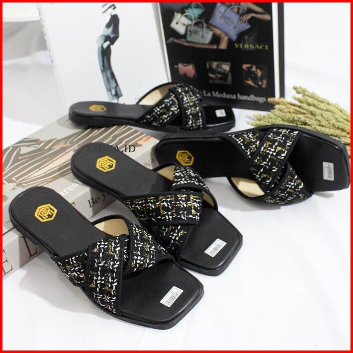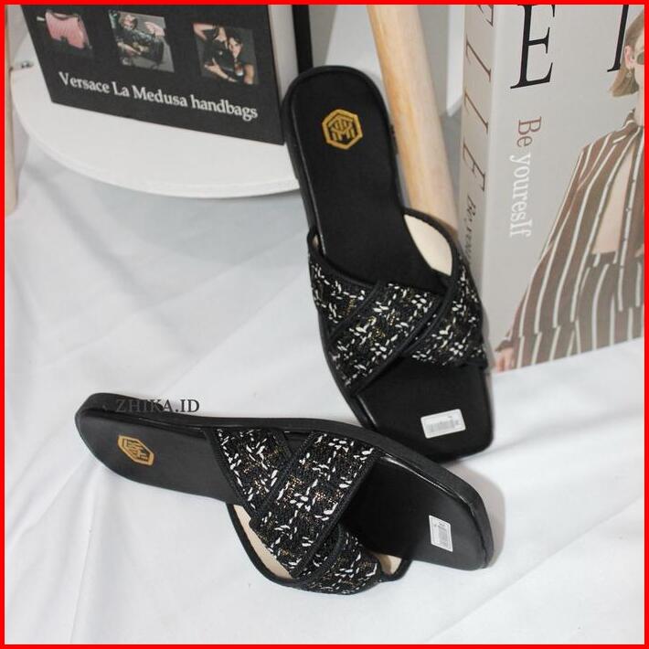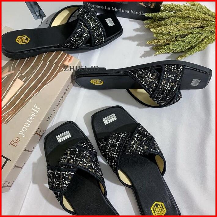 Sendal Flat Wanita Selop Sandal Teplek Cewek Slip On Kasual Perempuan Kekinian Size 36-40 Hitam