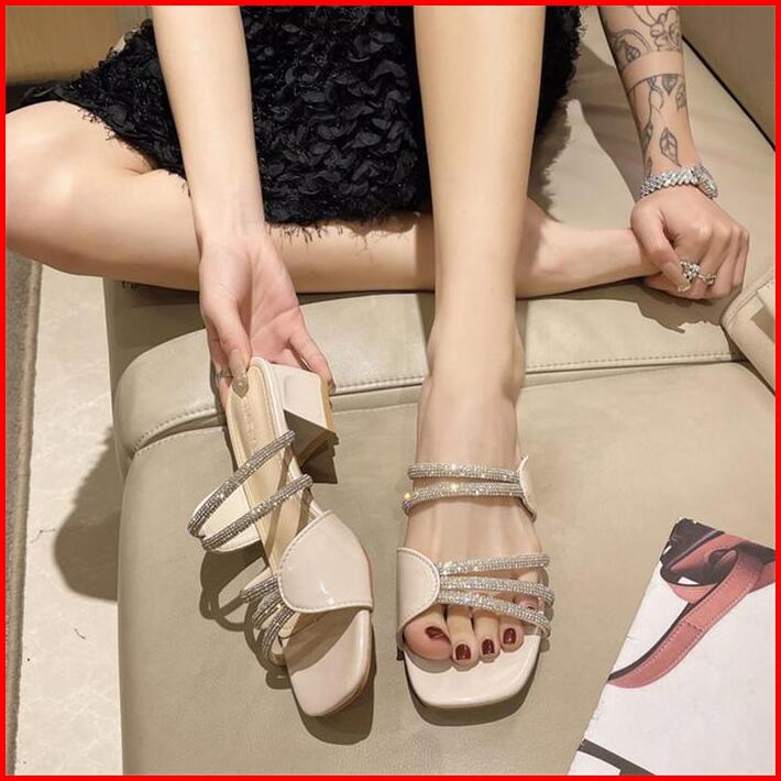 Sandal Hak Wanita Miska Permata Kekinian Tinggi 5 Cm Karet