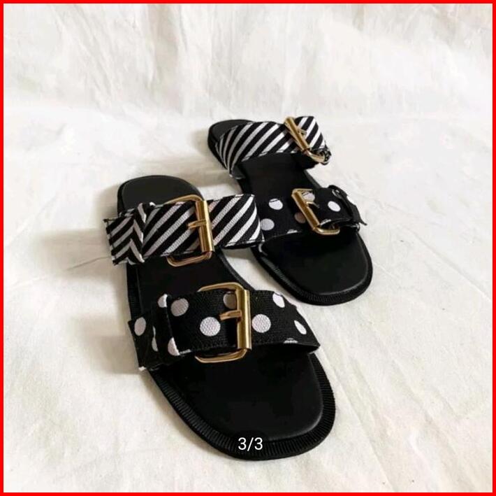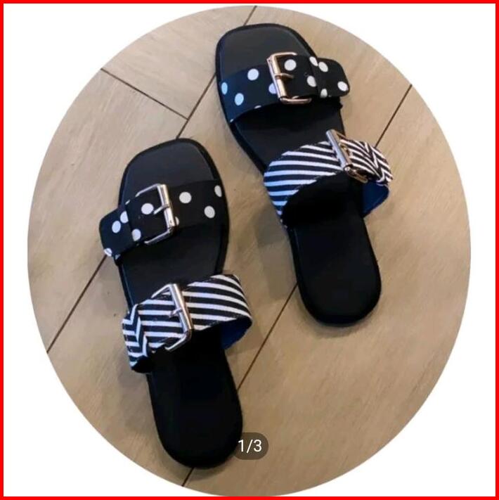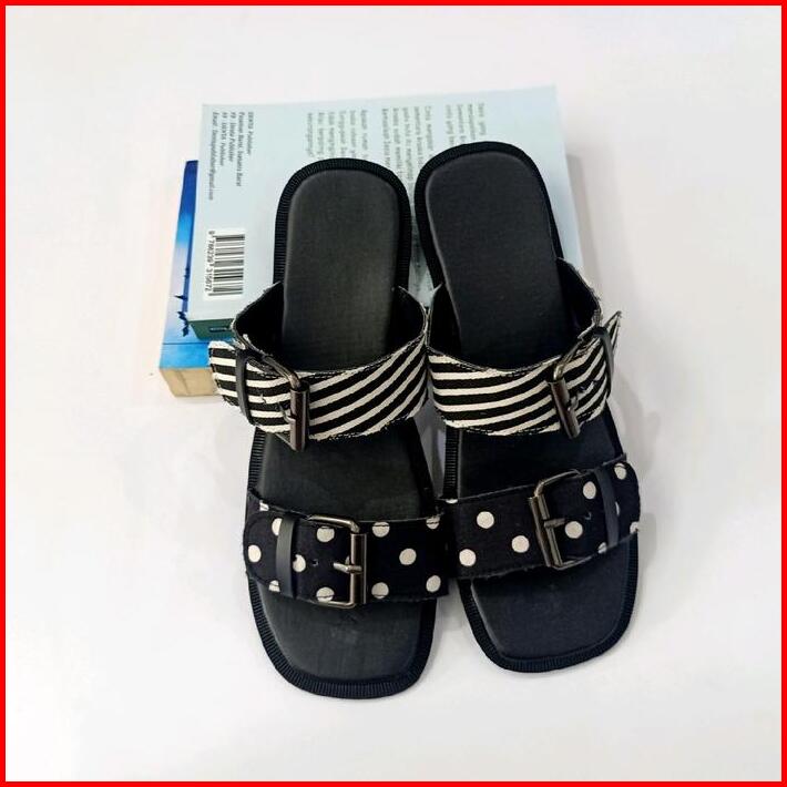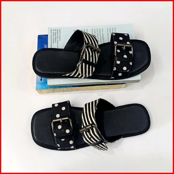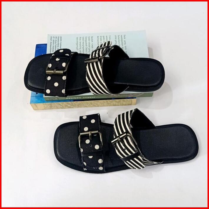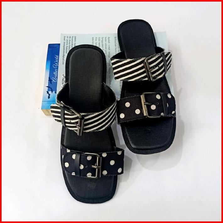 Sandal Flat Natasha Polkadot Garis 2 Strap Wanita Canvas