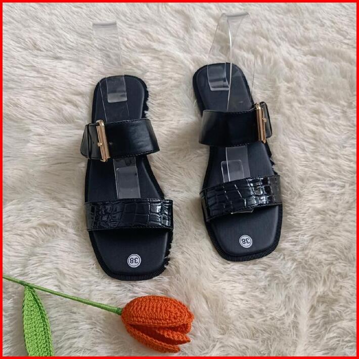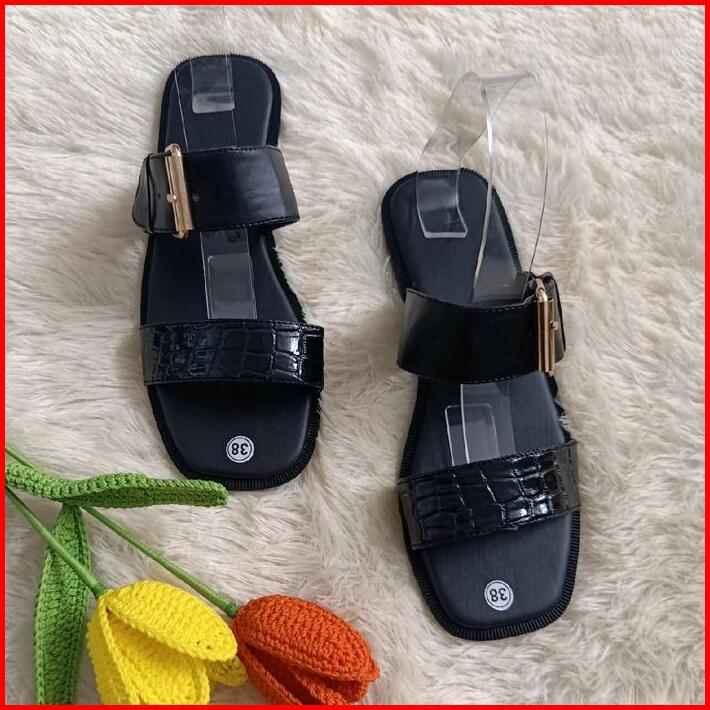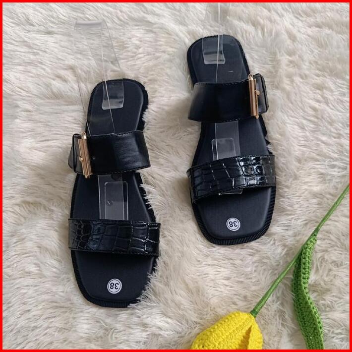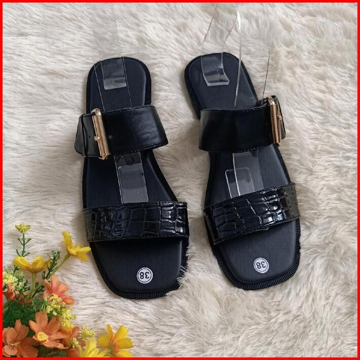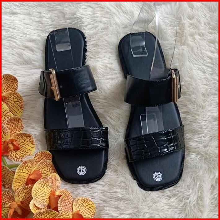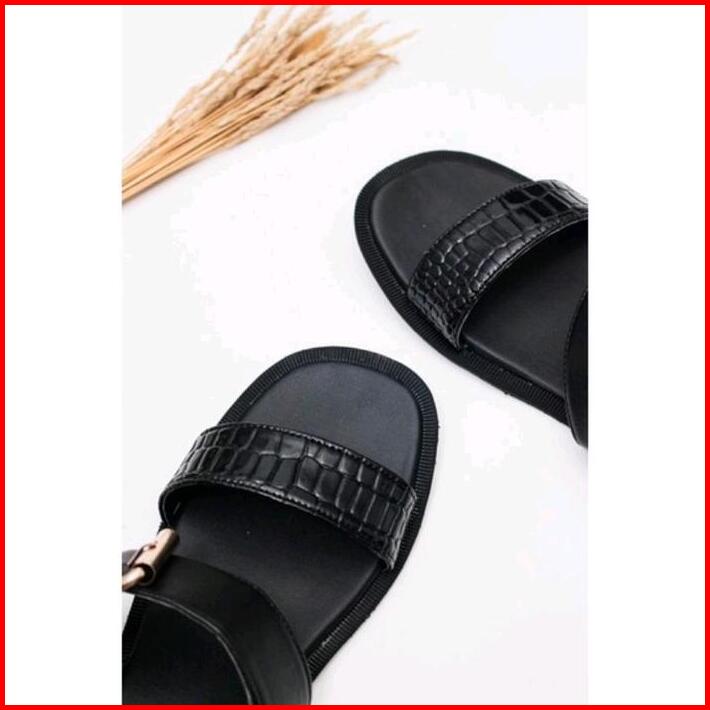 Sandal Flat Croco Sintetis Hitam Monaliza Wanita