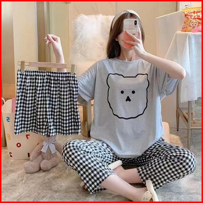 Piyama Wanita 3 In 1 Baju Tidur Setelan Wanita Panjang Dewasa Motif Musim Panas Polka Dot Setrip Bunga Polos