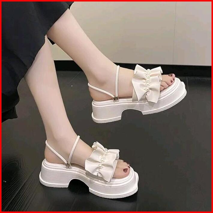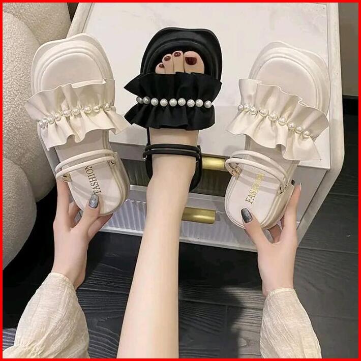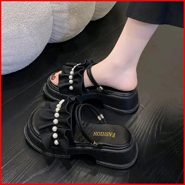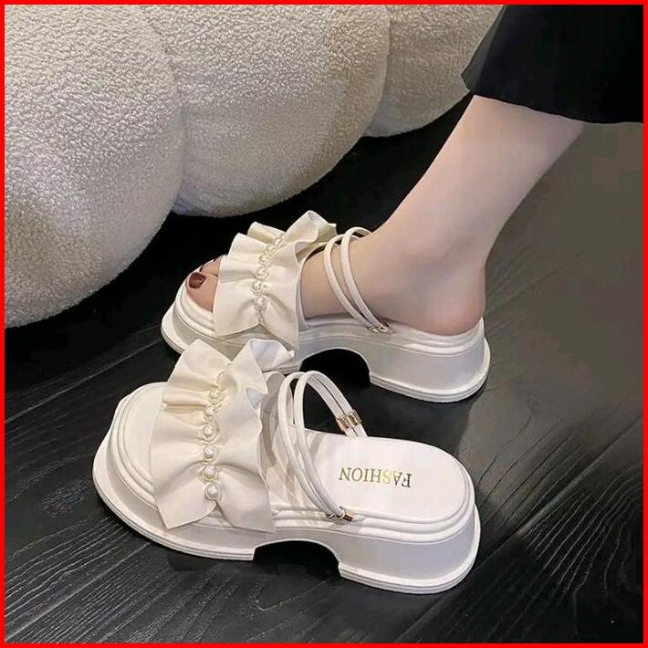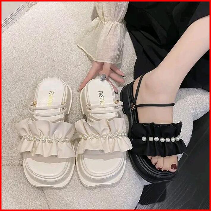 Sandal Wedges Wanita Fashion Korea Tali Kerut Mutiara Sendal Cewek