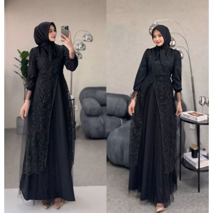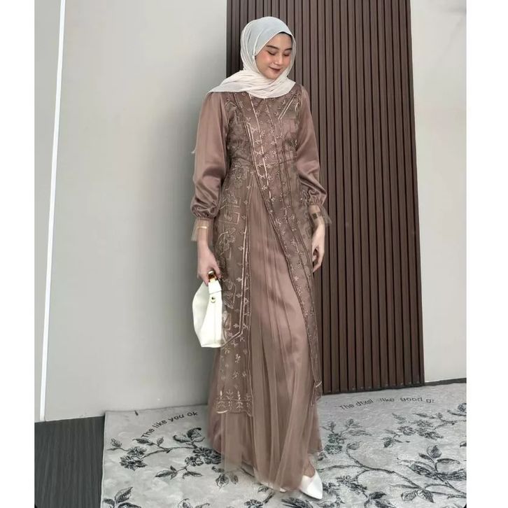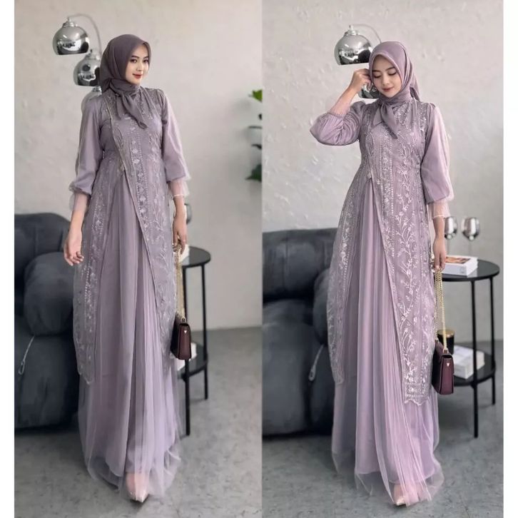 kinar dress silk kombinasi tile garden premium warna burgundy gamis brukat tile pesta wanita mewah