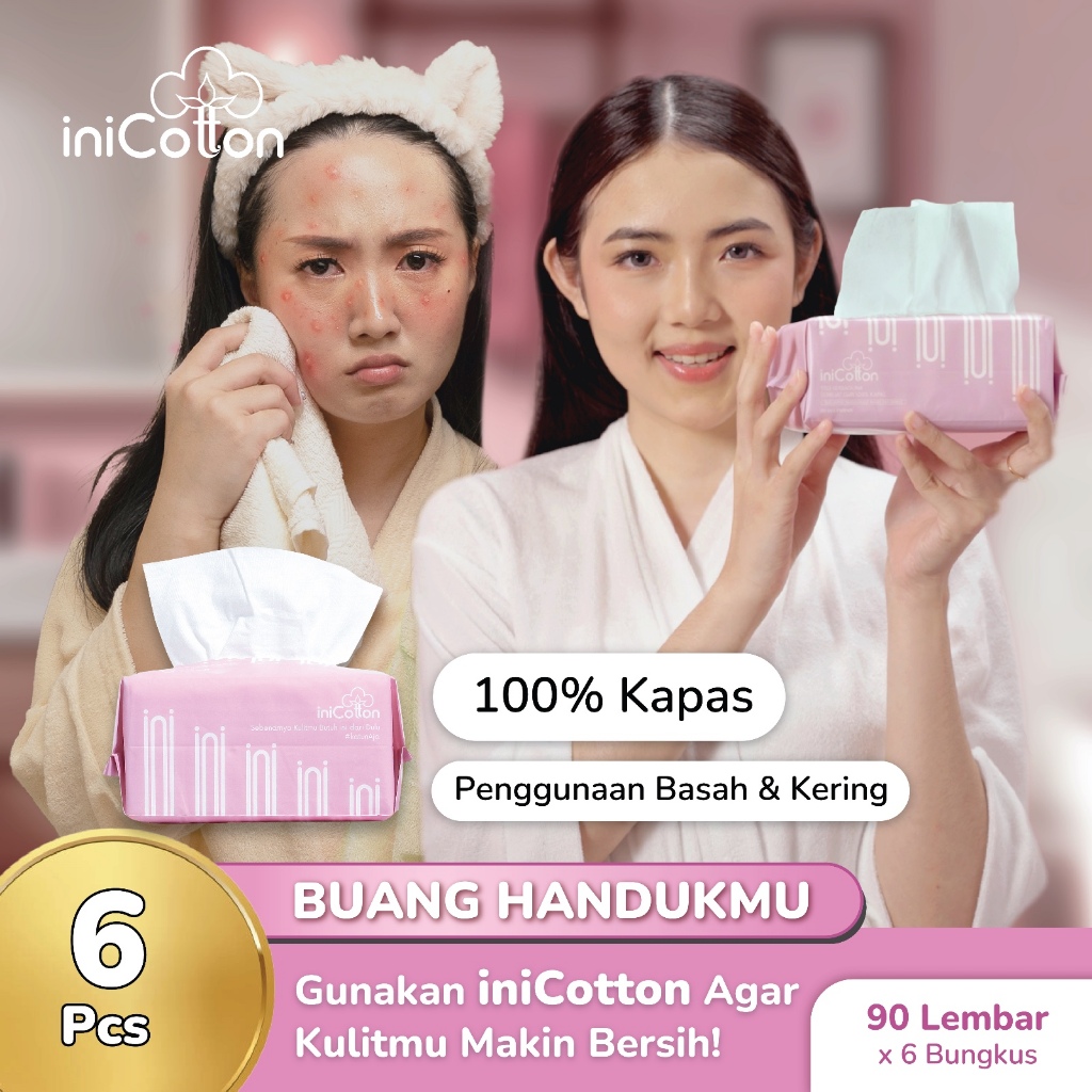 (6 Bungkus) iniCotton Tisu Wajah 100% Cotton, Tisu Lembut Sekali Pakai, Kering & Basah, 90 lembar