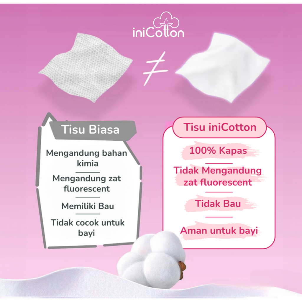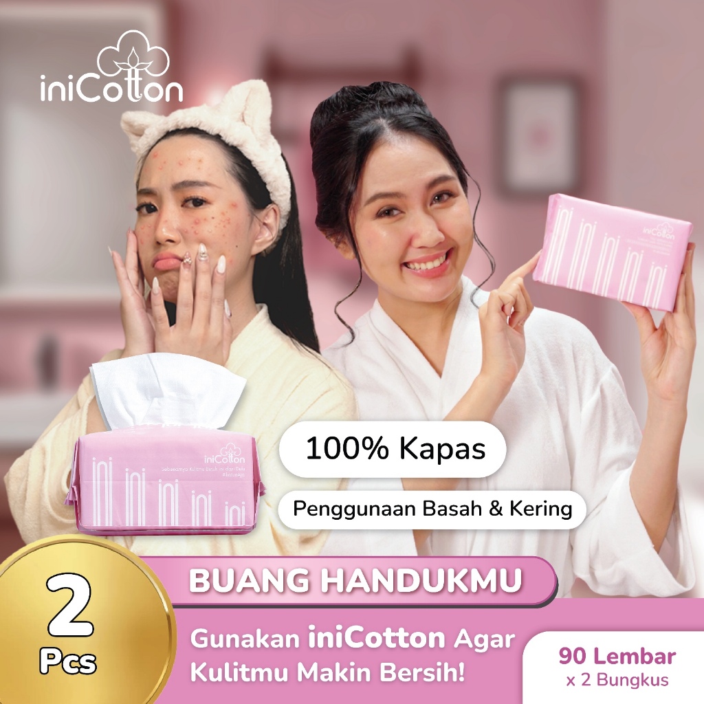 (2 Bungkus) iniCotton Tisu Wajah 100% Cotton, Tisu Lembut Sekali Pakai, Kering & Basah, 90 lembar