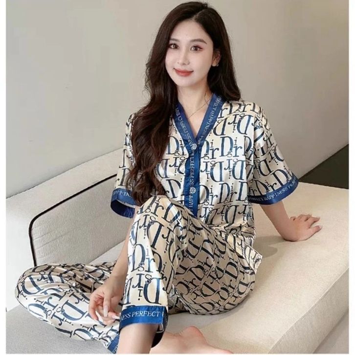 Baju Tidur Setelan Satu Set Piyama Pajamas Wanita Impor Celana Panjang Satin Premium Lengan Pendek