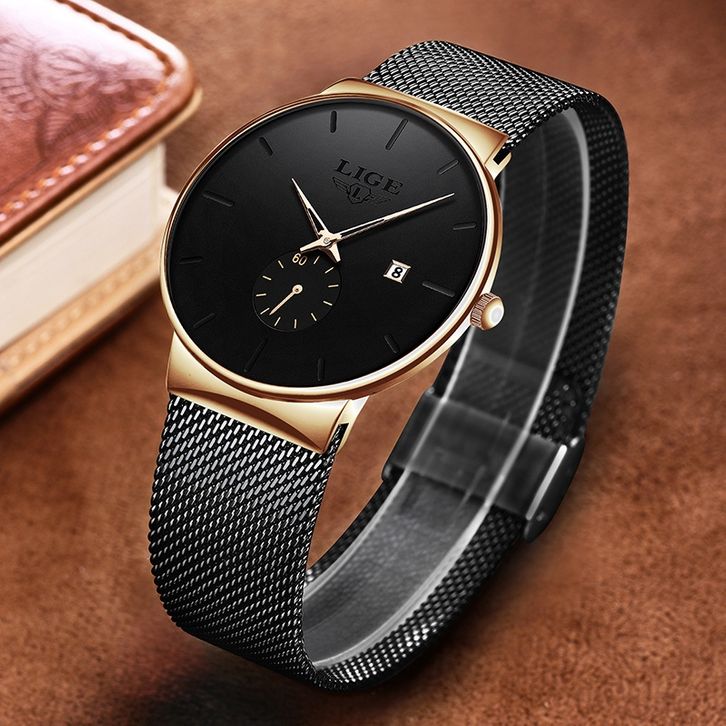 LIGE Jam Tangan Pria Hitam Sabuk Jaring Anti Air Kasual Sederhana Jam Tangan Wanita + Kotak
