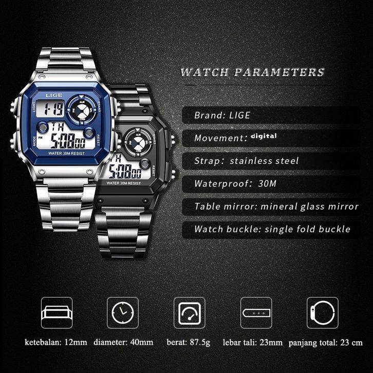 LIGE Original Jam Tangan Pria Digital Fashion Anti Air Baja Tahan Karat Kalender Bercahaya Jamtangan
