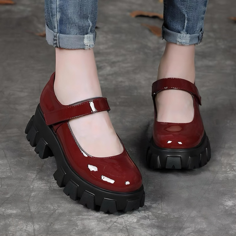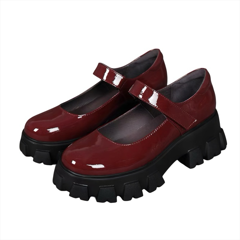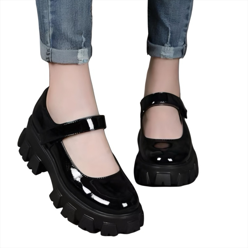 Sepatu Mary Jane Hak Tahu Tinggi Wanita Import Kulit Murah Premium Marun Hitam Sol Karet Strap Docmart Cewek High 5cm Chunky Block Heels Black maron Platform Shoes - Ukuran 37 38 39 40
